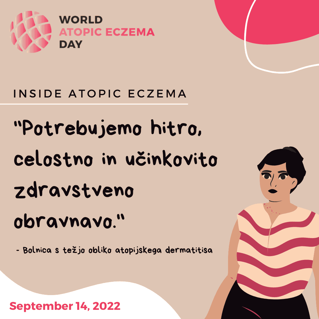 Atopijski dermatitis je bolezen imunskega sistema, ki močno prizadene kvaliteto življenja bolnika in njegovih svojcev. Je bolezen, ki močno prizadene kožo, ki je v središču drugih zdravstvenih težav; vpliva na duševno zdravje in vodi v razvoj drugih bolezni. Bolezen je izjemno težka za bolnike in njihove družine ter resno vpliva na vsakdanje življenje. Ne glede na to, ali živite z atopijskim dermatitisom ali skrbite za nekoga s to boleznijo je vaš glas pomemben!